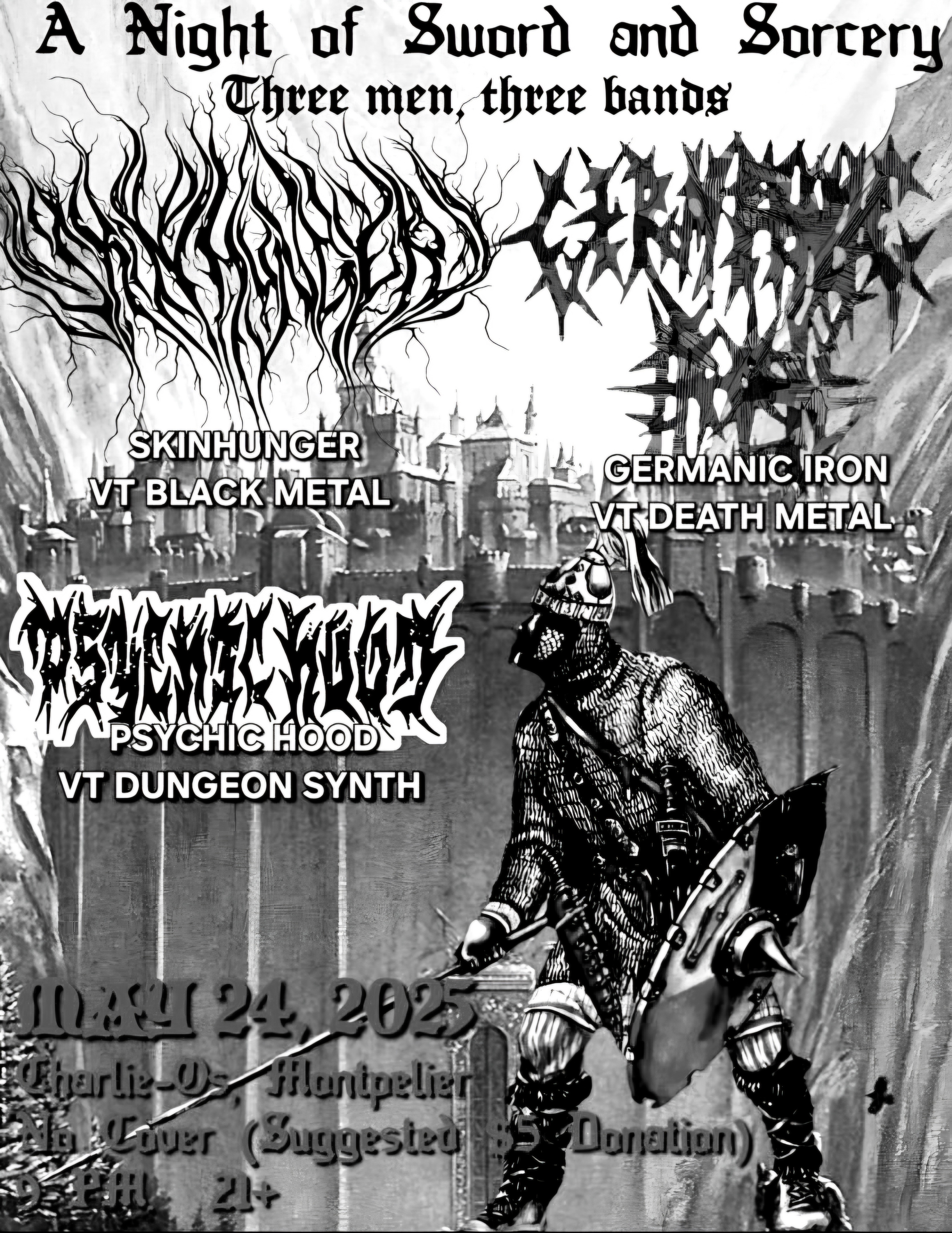 Saturday, May 24th 2025 at Charlie O's in Montpelier, VT, All one-man bands with Germanic Iron and Psychic Hood
